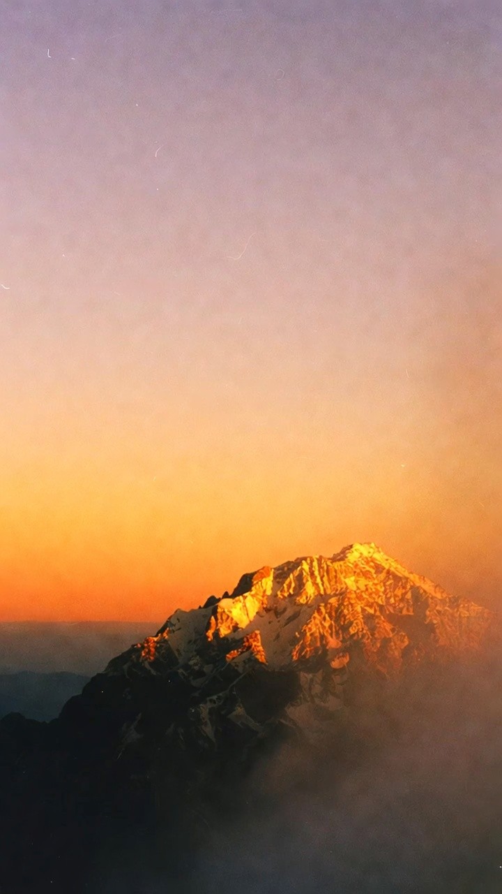 A stunning vertical photograph of a sharp, snow-dusted mountain peak illuminated by the first light of day. The summit glows with a brilliant, saturated orange and gold, while the rest of the mountain is shrouded in thick, soft-focus clouds. The sky transitions from a bright, hazy orange near the horizon to a delicate, pale lavender-pink at the top. The image has a textured, cinematic film grain, creating a dreamlike and majestic atmosphere that highlights the peak as a singular point of light.
