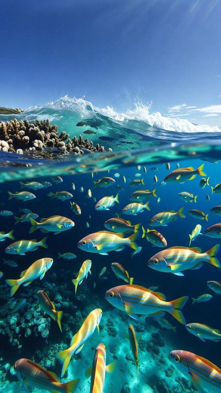 Experience the best of both worlds with this stunning split-level live wallpaper. Above the surface, a brilliant blue sky meets a rugged coral coastline. Just below the gentle, splashing waves, a vibrant school of yellow and white striped tropical fish swims through crystal-clear ocean water. This dynamic, dual-perspective scene brings a uniquely refreshing and lively summer energy to your lock screen.